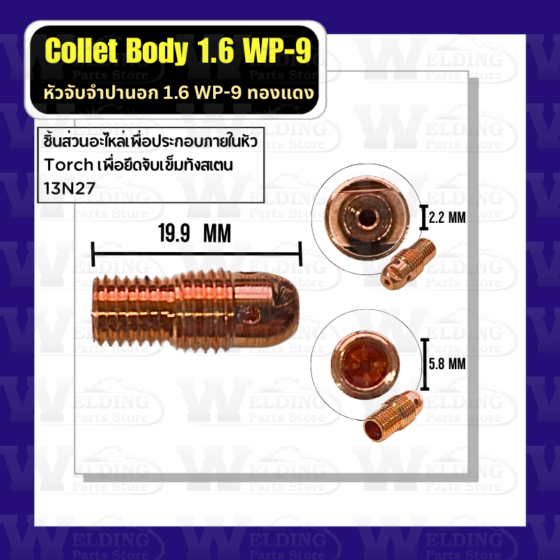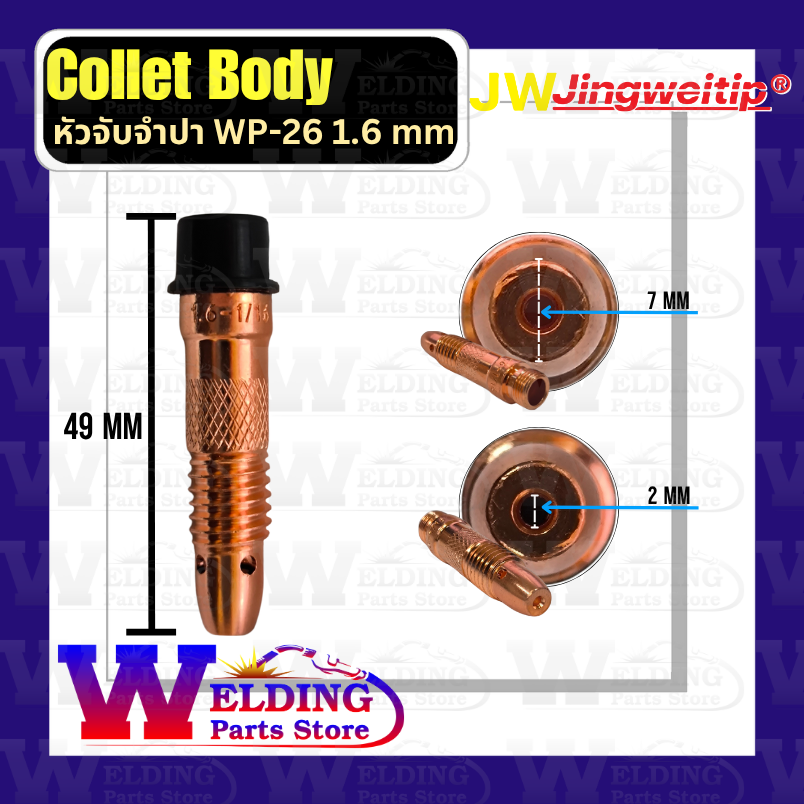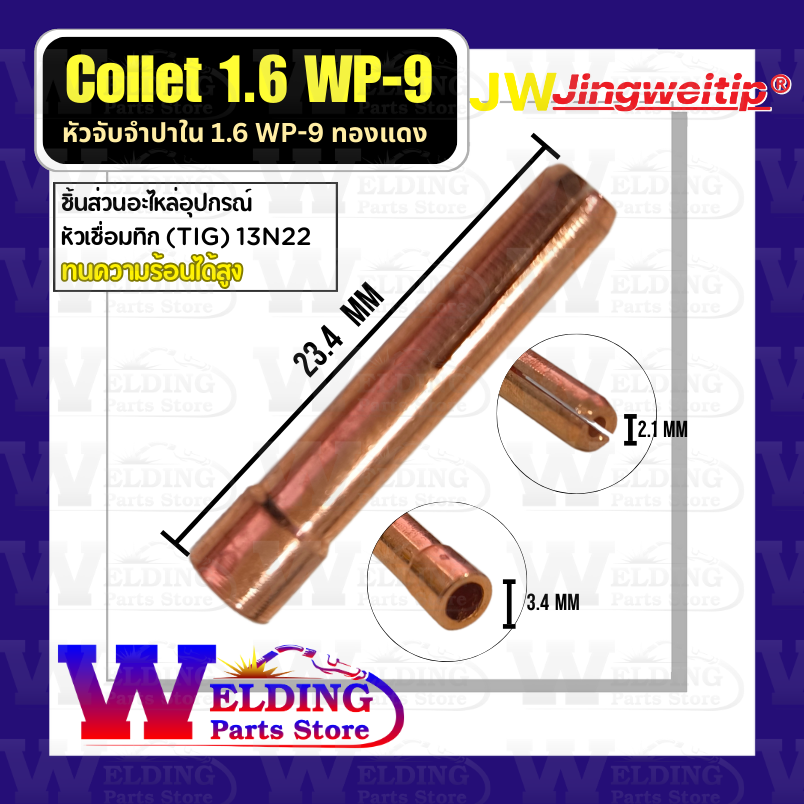 หัวจับจำปาในขนาด 1.6 สำหรับหัวเชื่อม TIG รุ่น WP-9 ทองเหลือง สามารถทนความร้อนได้สูง