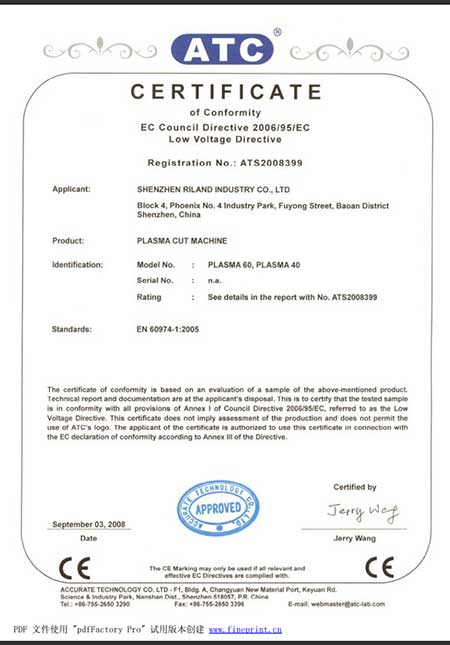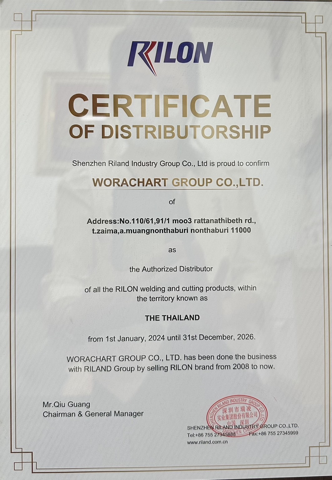 ใบรับรองการเป็นตัวเเทนจำหน่ายเครื่องเชื่อม RILON ในประเทศไทย